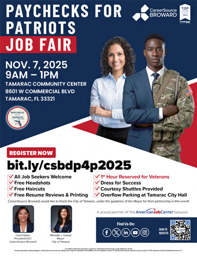 TAMARAC, Fla. – CareerSource Broward will host its 13th annual Paychecks for Patriots Job Fair on Friday, November 7, 2025, connecting veterans, military spouses, and job seekers with local employers looking to hire. The event is hosted in partnership with the CareerSource Florida network, FloridaCommerce, and the Florida Department of Veterans’ Affairs.